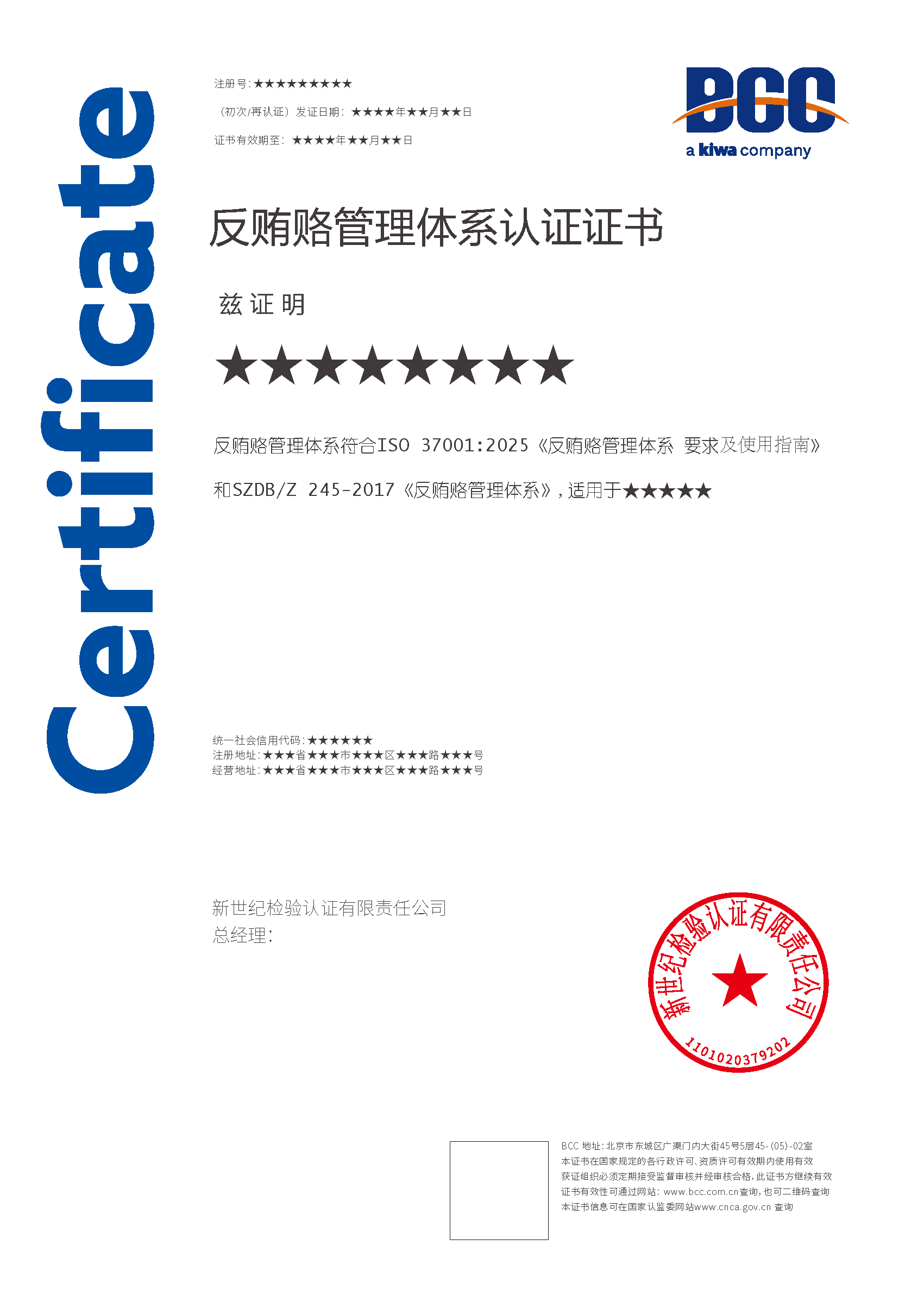 本頁涉及的認(rèn)證服務(wù)中均有對(duì)應(yīng)的《認(rèn)證實(shí)施規(guī)則》,BCC擁有其最終解釋權(quán)。任何組織及個(gè)人未經(jīng)BCC許可,不得以任何形式全部或部分使用(法律要求除外)認(rèn)證相關(guān)信息。如需獲取相關(guān)實(shí)施規(guī)則請(qǐng)用以下方式聯(lián)系獲取:電話:010-58579316 郵箱:fwjs@kiwa.cn