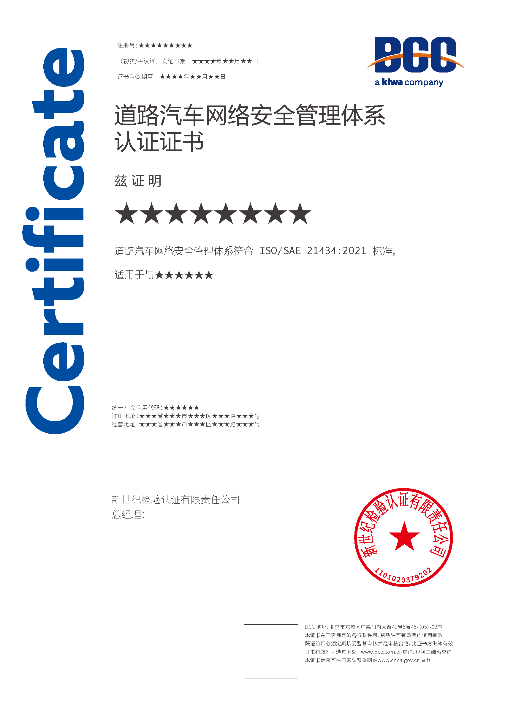 本頁涉及的認證服務中均有對應的《認證實施規(guī)則》,BCC擁有其最終解釋權(quán)。任何組織及個人未經(jīng)BCC許可,不得以任何形式全部或部分使用(法律要求除外)認證相關信息。如需獲取相關實施規(guī)則請用以下方式聯(lián)系獲取:電話:010-58579316 郵箱:fwjs@kiwa.cn