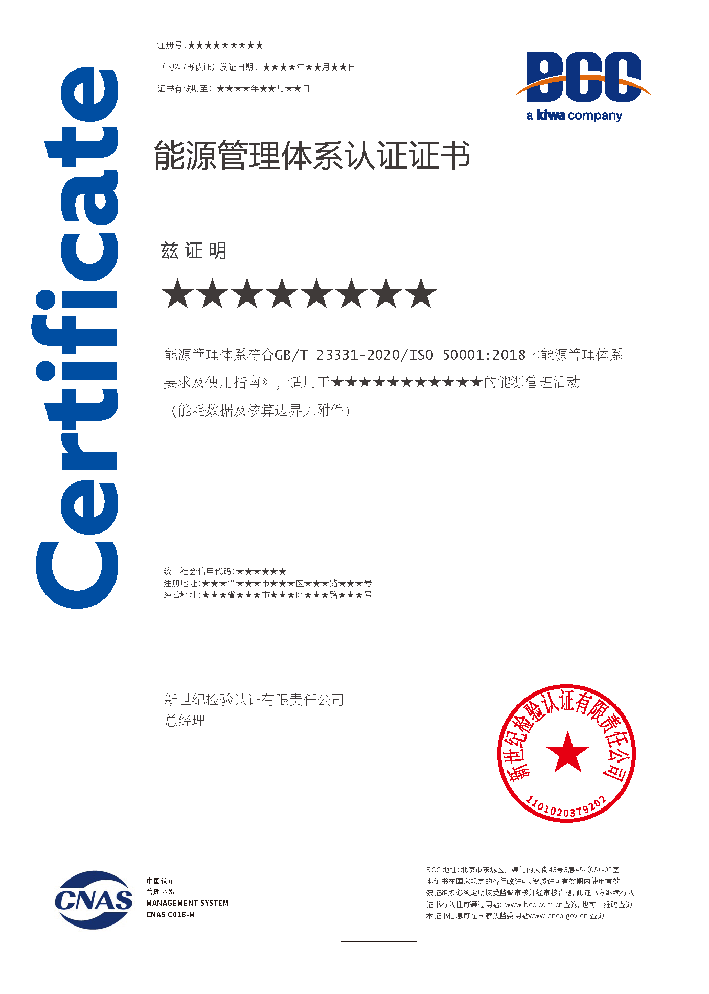 能源管理體系認證證書 能源管理體系認證證書(能耗附件)