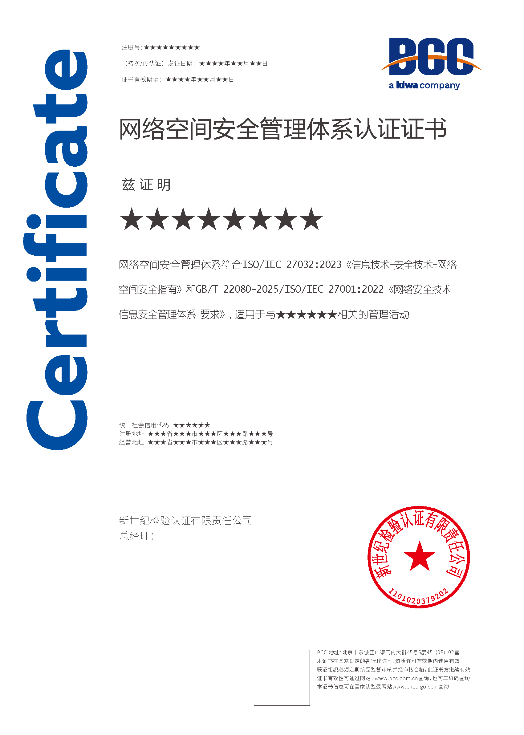 本頁涉及的認(rèn)證服務(wù)中均有對(duì)應(yīng)的《認(rèn)證實(shí)施規(guī)則》,BCC擁有其最終解釋權(quán)。任何組織及個(gè)人未經(jīng)BCC許可,不得以任何形式全部或部分使用(法律要求除外)認(rèn)證相關(guān)信息。如需獲取相關(guān)實(shí)施規(guī)則請(qǐng)用以下方式聯(lián)系獲?。弘娫挘?10-58579316 郵箱:fwjs@kiwa.cn