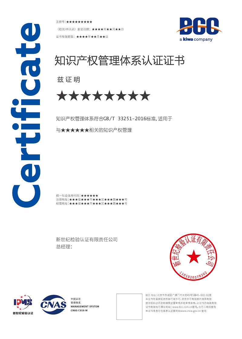 Kiwa BCC是首批獲CNAS認可的知識產(chǎn)權認證機構,可為企業(yè)頒發(fā)帶有“CNAS”標識的知識產(chǎn)權管理體系認證證書。認證所用標準包括:GB/T 29490-2023《企業(yè)知識產(chǎn)權合規(guī)管理體系要求》、GB/T33250-2016《科研組織知識產(chǎn)權管理規(guī)范》、GB/T33251-2016《高等學校知識產(chǎn)權管理規(guī)范》。