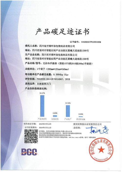 BCC審核組采用現(xiàn)場與遠(yuǎn)程審核相結(jié)合的形式,依據(jù)PAS 2050:2011及ISO 14067:2018標(biāo)準(zhǔn),對開璞環(huán)保的無紡布手提袋(國窖1573酒2010版500ml手提袋)進(jìn)行產(chǎn)品碳足跡核查。