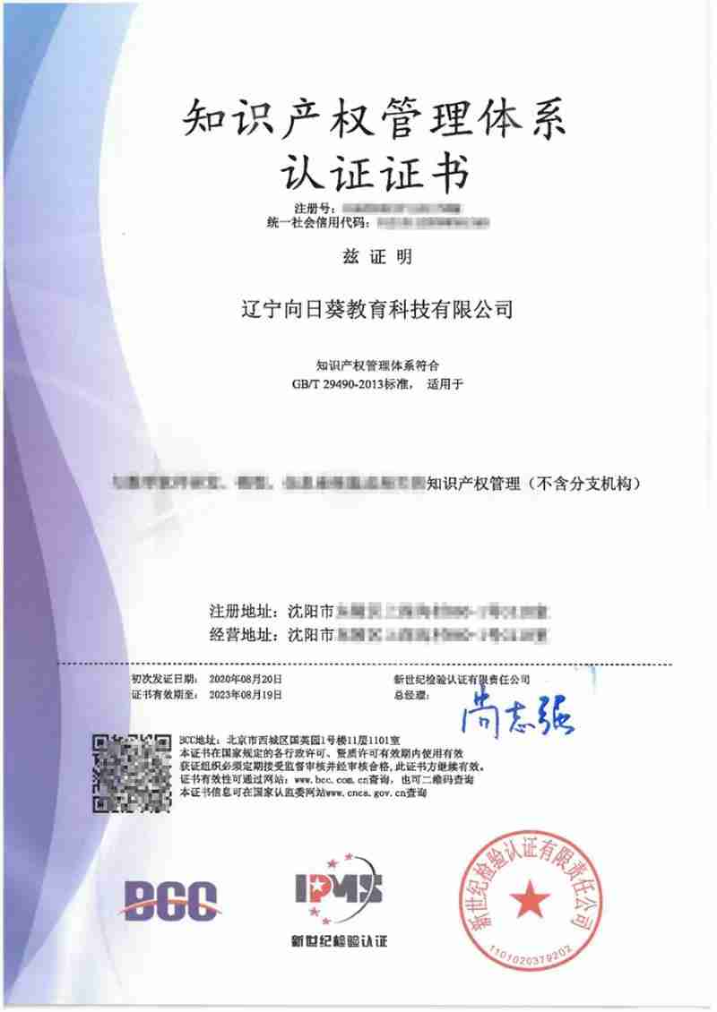 近日,向日葵教育科技順利通過知識產(chǎn)權(quán)管理體系認(rèn)證審核,喜獲由新世紀(jì)檢驗認(rèn)證有限責(zé)任公司(簡稱BCC)頒發(fā)的知識產(chǎn)權(quán)管理體系認(rèn)證證書。