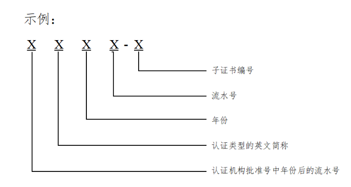 內(nèi)資認(rèn)證機(jī)構(gòu)認(rèn)證證書(shū)編號(hào)為該機(jī)構(gòu)批準(zhǔn)號(hào)的3位或4位阿拉伯?dāng)?shù)字流水號(hào);外資認(rèn)證機(jī)構(gòu)認(rèn)證證書(shū)編號(hào)為F+該機(jī)構(gòu)批準(zhǔn)號(hào)的2位或3位阿拉伯?dāng)?shù)字流水號(hào)。